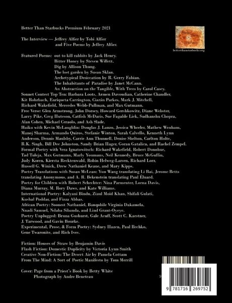 Better Than Starbucks February 2021 Premium The Interview - Jeffrey Alfier by Tobi Alfier and Five Poems by Jeffrey Alfier. Featured Poems: out to kill rabbits by Jack Henry, Bitter Honey by Steven Willett, Dig by Allison Thung, The lost garden by Susan Sklan, Archetypical Desiccation by R. Gerry Fabian, The Inhabitants of Paradise by Janet McCann, and An Abstraction on the Tangible, With Trees by Carol Casey. Sonnet Contest Top Ten: Barbara Loots, Armen Davoudian, Catherine Chandler, Kit Rohrbach, Enriqueta Carrington, Ciarán Parkes, Mark J. Mitchell, Richard Wakefield, Mercedes Webb-Pullman, and Max Gutmann. Free Verse: Glen Armstrong, John Dorsey, Howard Gershkowitz, Diane Webster, Larry Pike, Greg Huteson, Catfish McDaris,¿Sue Fagalde Lick, Sudhanshu Chopra, Alan Cohen, Michael Ceraolo, and Ash Slade. Haiku with Kevin McLaughlin: Douglas J. Lanzo, Jessica Wheeler, Mathew Wenham, Manoj Sharma, Armando Quiros, Stefanie Winton, Sarah Calvello, Kenneth Lynn Anderson, Dennis Maulsby, Carrie Ann Thunnell, Denise Shelton, Carlton Holte, R.K. Singh, Bill Dee Johnston, Sandy Brian Hager, Goran Gatalica, and Rachel Zempel. Formal Poetry with Vera Ignatowitsch: Richard Wakefield, Robert Donohue, Tad Tuleja, Max Gutmann, Marly Youmans, Neil Kennedy, Bruce McGuffin, Judy Koren, Kiersta Recktenwald, Robin Helweg-Larsen, Richard Lorr, Russell G. Winick, Drew Nathaniel Keane, and Mary Kipps. Poetry Translations with Susan McLean: Yun Wang translating Li Bai, Jerome Betts translating Anonymous, and A. R. Bekenstein translating Paul Éluard. Poetry for Children with Robert Schechter: Nina Parmenter, Diana Murray, M. Rory Daws, Kate Williams, and Lorna Davis. International Poetry: Kalyani Bindu, Ziaul Moid Khan, Shifali Gulati, Kushal Poddar, and Fizza Abbas. African Poetry: Soonest Nathaniel, Banqobile Virginia Dakamela, Nnadi Samuel, Ndaba Sibanda, and Lind Grant-Oyeye. Poetry Unplugged: Bruna Gushurst, Scott C. Kaestner, Gavin Bourke, Gale Acuff, and J. Tarwood. Experimental, Prose, & Form Poetry: Sydney Hazen, Paul Ilechko, Gene Twaronite, and Rich Ives. Fiction: Houses of Straw by Benjamin Davis Flash Fiction: Domestic Duplicity by Victoria Lynn Smith Creative Non-Fiction: The Desert Air by Pamela Cottam From The Mind: A Sort of Poetic Manifesto by Tom Merrill Cover: Page from a Priest's Book by Betty White Photograph by Andre Beneteau