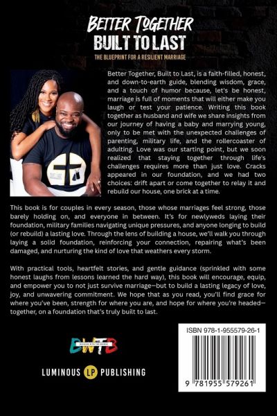 Better Together, Built to Last, is a faith-filled, honest, and down-to-earth guide, blending wisdom, grace, and a touch of humor because, let's be honest, marriage is full of moments that will either make you laugh or test your patience. Writing this book together as husband and wife we share insights from our journey of having a baby and marrying young, only to be met with the unexpected challenges of parenting, military life, and the rollercoaster of adulting. Love was our starting point, but we soon realized that staying together through life's challenges requires more than just love. Cracks appeared in our foundation, and we had two choices: drift apart or come together to relay it and rebuild our house, one brick at a time. This book is for couples in every season, those whose marriages feel strong, those barely holding on, and everyone in between. It's for newlyweds laying their foundation, military families navigating unique pressures, and anyone longing to build (or rebuild) a lasting love. Through the lens of building a house, we'll walk you through laying a solid foundation, reinforcing your connection, repairing what's been damaged, and nurturing the kind of love that weathers every storm. With practical tools, heartfelt stories, and gentle guidance (sprinkled with some honest laughs from lessons learned the hard way), this book will encourage, equip, and empower you to not just survive marriage-but to build a lasting legacy of love, joy, and unwavering commitment. We hope that as you read, you'll find grace for where you've been, strength for where you are, and hope for where you're headed-together, on a foundation that's truly built to last.