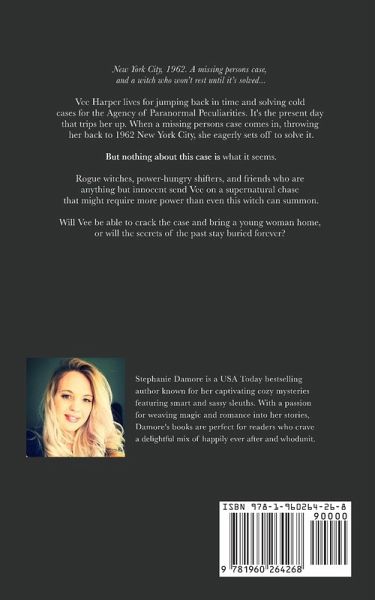 New York City, 1962. A missing persons case, and a witch who won't rest until it's solved... I'm Vee Harper and I live for jumping back in time and solving cold cases for the Agency of Paranormal Peculiarities. It's the present day that trips me up. So when a missing persons case comes in, throwing me back to 1962 New York City, I set off to solve it. But nothing about this case is what it seems. Rogue witches, power-hungry shifters, and friends who are anything but innocent send me on a supernatural chase that might require more power than even I can summon. Can I solve the case before my time is up or will a young woman remain missing forever? If you love paranormal cozies with a twist of time travel, you're going to love this series!