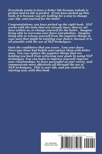 Everybody wants to have a better life because nobody is perfect and no life is perfect. If you have picked up this book, it is because you are looking for a way to change your life, and yourself for the better. Congratulations, you have picked up the right book. NLP works with the tools that you already have, that we all have within us, to change yourself for the better. Imagine being able to overcome your fears and phobias. Imagine being able to release yourself from the negative things in your past that might be tainting your future, because it is all possible with the use of NLP techniques. Gain the confidence that you crave. Lose your fears. Overcome those bad habits and replace them with better ones. You can replace the negative things that are holding you back from achieving your goals by using NLP techniques. This is your life, and you control it, starting now, with this book.
