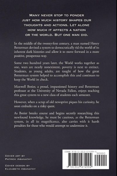 Many never ponder just how much history shapes our thoughts and actions, or even our nation and world. But one man did. In the middle of the twenty-first century, a man named Henry Betterman devised a system to democratically rid the world of its inherent dark history allowing it to grow in a more positive, prosperous way. Two centuries later, the World works together as one, wars are nearly nonexistent, and poverty is next to extinct. Young adults are taught how the great Betterman system accomplished this and continues to keep the World in check. Maxwell Botier, a proud, impassioned history and Betterman professor at the Univerisity of Nevada Fallon, enjoys teaching this great system each semester. However, when a scrap of old newsprint surfaces, he soon embarks on a risky quest. As Botier begins secretly researching this newfound treasure, he must be cautious, as the Betterman system, in all its magnificence, also carries with it harsh penalties for those who would attempt to undermine it.