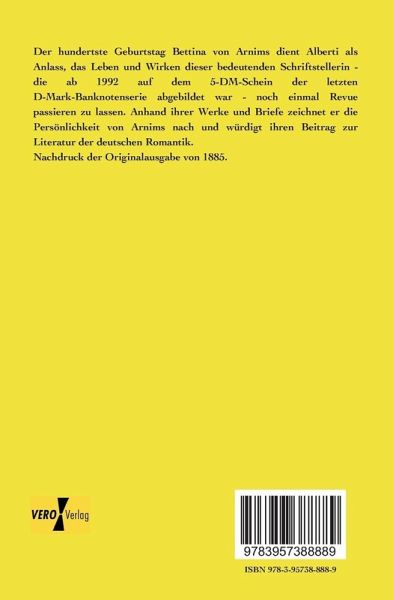 Der hundertste Geburtstag Bettina von Arnims dient Alberti als Anlass, das Leben und Wirken dieser bedeutenden Schriftstellerin - die ab 1992 auf dem 5-DM-Schein der letzten D-Mark-Banknotenserie abgebildet war - noch einmal Revue passieren zu lassen. Anhand ihrer Werke und Briefe zeichnet er die Persönlichkeit von Arnims nach und würdigt ihren Beitrag zur Literatur der deutschen Romantik.