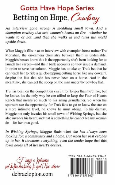 An interview gone wrong. A meddling small town. And a champion cowboy that sets women's hearts on fire-whether he wants to or not...and then she walks in and turns his world upside down. When Maggie fills in at an interview with champion horse trainer Tru Monahan, the on-camera chemistry between them is undeniable. Maggie's bosses know this is the opportunity she's been looking for to launch her career-and their bank accounts so they issue a demand. In order to save her column, Maggie has to take up Tru's bet that he can teach her to ride a quick-stepping cutting horse like any cowgirl, despite the fact that she has never been on a horse. And in the meantime, she can get the scoop on the man under the cowboy hat. Tru has been on the competition circuit for longer than he'd like, but he knows it's the only way he can afford to keep the Four of Hearts Ranch that means so much to his ailing grandfather. So when his sponsors see the opportunity for Tru's fans to get to know the star on a more intimate level, he knows he must oblige. To his dismay, Maggie not only invades his small town of Wishing Springs, but she also invades his heart, and that is something he cannot let any woman do-for her own good. In Wishing Springs, Maggie finds what she has always been looking for: a community and a home. But when her past catches up to her, it threatens everything, even the tender hope that this town holds all of her heart's desires.