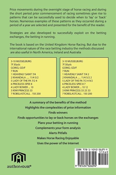 Several years of experience in betting on horses has been used in this book to formulate novel methods . Although this book is particularly useful when one is using the betting exchanges it is also useful for betting with the bookmakers. As one gains experience with the methods one gains the know-how to make the right choices . Although they are entirely based on United Kingdom horse racing, because of the international nature of the betting industry, they are also useful in other countries such as North America and Australia.Price movements during the overnight stage of racing and during the short period prior to commencement of racing often give rise to patterns that can be used to decide when to lay ' or ' back ' horses. Several examples of races where these patterns are seen during the past 12 months of racing are selected and presented for the benefit of the reader. Stategies are also developed to exploit the betting in running opportunity.