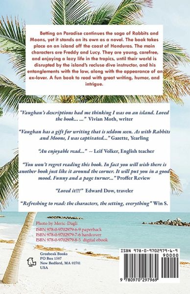 Betting on Paradise is an island sleuth. It is also a story about not wanting to grow up. The location is set on an island off of Honduras. The two main characters, Lucy and Freddy, are content with their lack of responsibilities in life. The island locals, however, are not content with their lot in life and have devised a means to put themselves on the map, along with making more money. Due to serendipitous events and circumstances, dreams are tested, and lives are changed. (Betting on Paradise can be perceived as a sequel to Rabbits and Moons or stand-alone.)