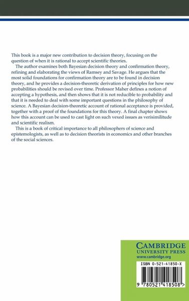 This book is a major new contribution to decision theory, focusing on the question of when it is rational to accept scientific theories. The author examines both Bayesian decision theory and confirmation theory, refining and elaborating the views of Ramsey and Savage. He argues that the most solid foundation for confirmation theory is to be found in decision theory, and he provides a decision-theoretic derivation of principles for how many probabilities should be revised over time. Professor Maher defines a notion of accepting a hypothesis, and then shows that it is not reducible to probability and that it is needed to deal with some important questions in the philosophy of science. A Bayesian decision-theoretic account of rational acceptance is provided together with a proof of the foundations for this theory. A final chapter shows how this account can be used to cast light on such vexed issues as verisimilitude and scientific realism.