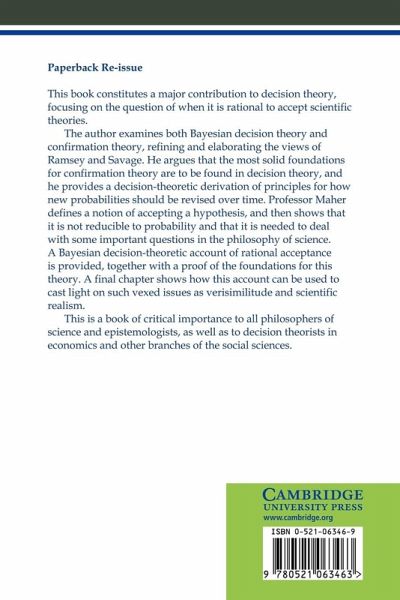 This book is a major contribution to decision theory, focusing on the question of when it is rational to accept scientific theories. The author examines both Bayesian decision theory and confirmation theory, refining and elaborating the views of Ramsey and Savage. He argues that the most solid foundation for confirmation theory is to be found in decision theory, and he provides a decision-theoretic derivation of principles for how many probabilities should be revised over time. Professor Maher defines a notion of accepting a hypothesis, and then shows that it is not reducible to probability and that it is needed to deal with some important questions in the philosophy of science. A Bayesian decision-theoretic account of rational acceptance is provided together with a proof of the foundations for this theory. A final chapter shows how this account can be used to cast light on such vexed issues as verisimilitude and scientific realism.