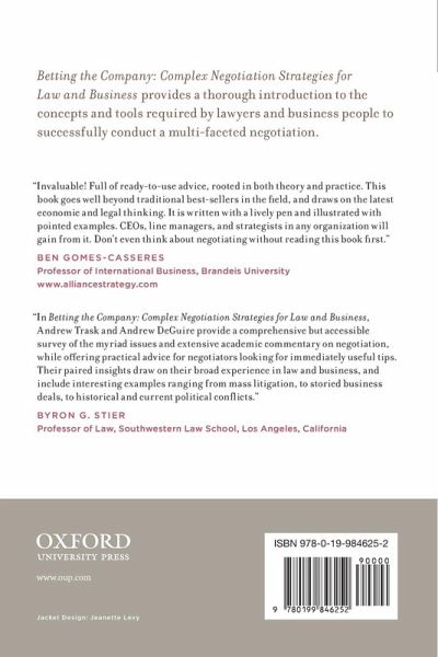Where the fate of a company is on the line in a negotiation, legal and business teams must work seamlessly to reach a successful conclusion. Unfortunately, there's often a gap between lawyers, who are typically untrained in business strategy, and business executives, who lack basic knowledge of contract law and regulations. In Betting the Company: Complex Negotiation Strategies for Law and Business, Andrew Trask and Andrew DeGuire offer a thorough introduction to enable lawyers and business people to understand the theoretical concepts and to apply practical tools to conduct a successful, multi-faceted negotiation. The authors, both of whom have extensive experience conducting high-stakes negotiation, explain the different strategic considerations negotiators face, from the pressures on individuals representing a larger group to the difficulties that arise from clashes of corporate culture. They also discuss the specific challenges raised by negotiations that involve multiple parties, multiple issues, and take place over longer periods of time. Throughout this illuminating book, Trask and DeGuire provide concrete, practical advice on how best to guide companies through the most difficult negotiations.