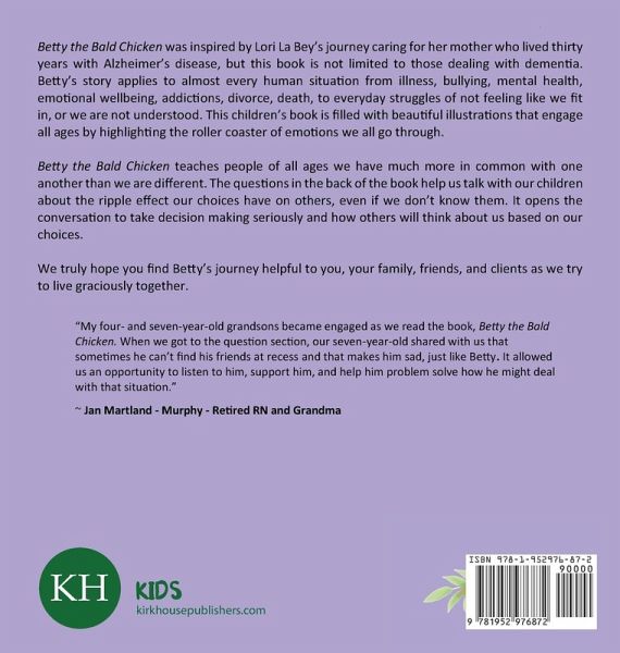 Betty the Bald Chicken was inspired by Lori La Bey's journey caring for her mother who lived thirty years with Alzheimer's disease, but this book is not limited to those dealing with dementia. Betty's story applies to almost every human situation from illness, bullying, mental health, emotional well-being, addictions, divorce, and death, to everyday struggles of not feeling like we fit in, or we are not understood. This children's book is filled with beautiful illustrations that engage all ages by highlighting the roller coaster of emotions we all go through. Betty the Bald Chicken teaches people of all ages we have much more in common with one another than we are different. The questions in the back of the book help us talk with our children about the ripple effect our choices have on others, even if we don't know them. It opens the conversation to take decision-making seriously and how others will think about us based on our choices. We truly hope you find Betty's journey helpful to you, your family, friends, and clients as we try to live graciously together.