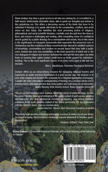 Public theology is an increasingly important area of theological discourse with strong global networks of institutions and academics involved in it. Elaine Graham is one of the UK's leading theologians and an established SCM author. In this book, Elaine Graham argues that Western society is entering an unprecedented political and cultural era, in which many of the assumptions of classic sociological theory and of mainstream public theology are being overturned. Whilst many of the features of the trajectory of religious decline, typical of Western modernity, are still apparent, there are compelling and vibrant signs of religious revival, not least in public life and politics - local, national and global. This requires a revision of the classic secularization thesis, as well as much Western liberal political theory, which set out separate or at least demarcated terms of engagement between religion and the public domain. Elaine Graham examines claims that Western societies are moving from 'secular' to 'post-secular' conditions and traces the contours of the 'post-secular': the revival of faith-based engagement in public sphere alongside the continuing - perhaps intensifying - questioning of the legi¬timacy of religion in public life. She argues that public theology must rethink its theological and strategic priorities in order to be convincing in this new 'post-secular' world and makes the case for the renewed prospects for public theology as a form of Christian apologetics, drawing from Biblical, classical and contemporary sources.