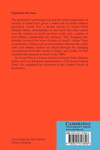 The protracted Arab-Israeli war and the central importance of security to Israel have given a major role to senior military personnel. Yoram Peri, a former adviser to Israeli Prime Minister Rabin, demonstrates in this book that state control over the military in Israel has been weak, and a pattern of civil-military partnership has emerged. This changing relationship involved the inner rivalries of Israel's Labour Party in particular. Clashes and accommodation between the politicians and military leaders are traced through the changing Governments from Ben Gurion to Begin, and, finally, Dr Peri examines the situation in Israel in the 1980s. Dr Yoram Peri was European representative of the Israeli Labour Party. He completed his doctorate at the London School of Economics.