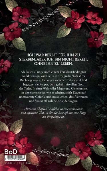 Ich war bereit, für ihn zu sterben, aber ich bin nicht bereit, ohne ihn zu leben. Als Dawns Lunge nach einem krankheitsbedingten Anfall versagt, wird sie in die magische Welt ihres Buches gezogen. Gefangen zwischen Leben und Tod begegnet sie Reaper, dem geheimnisvollen Gott des Todes. In einer Welt voller Magie und Geheimnisse, in der nichts so ist, wie es scheint, stößt Dawn auf unerwartete Gefühle und muss lernen, dass Vertrauen und Verrat oft nah beieinander liegen. "Between Chapters" entführt in eine verträumte und mystische Welt, in der das Böse oft nur eine Frage der Perspektive ist.
