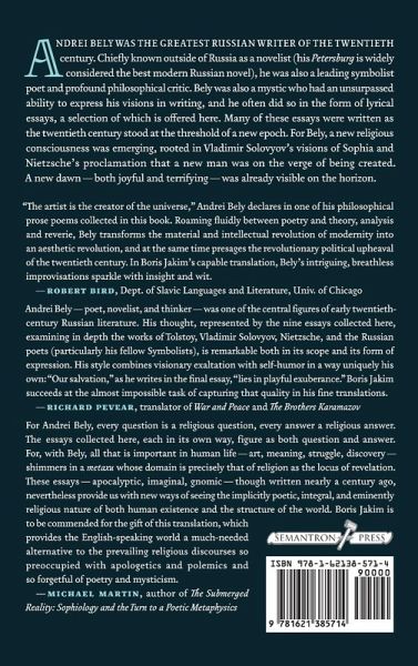 Andrei Bely was the greatest Russian writer of the twentieth century. Chiefly known outside of Russia as a novelist (his Petersburg is the best modern Russian novel), he was also a leading symbolist poet and profound philosophical critic. Bely was also a mystic who had an unsurpassed ability to express his visions in writing, and he often did so in the form of lyrical essays, a selection of which is offered here. Many of these essays were written as the twentieth century stood at the threshold of a new epoch. For Bely, a new religious consciousness was emerging, rooted in Vladimir Solovyov's visions of Sophia and Nietzsche's proclamation that a new man was on the verge of being created. A new dawn-both joyful and terrifying-was already visible on the horizon. "The artist is the creator of the universe," Andrei Bely declares in one of his philosophical prose poems collected in this book. Roaming fluidly between poetry and theory, between analysis and reverie, Bely transforms the material and intellectual revolution of modernity into an aesthetic revolution, and at the same time presages the revolutionary political upheaval of the twentieth century. In Boris Jakim's capable translation, Bely's intriguing, breathless improvisations sparkle with insight and wit.-Robert Bird, Dept. of Slavic Languages and Literature, Univ. of Chicago Andrei Bely-poet, novelist, and thinker-was one of the central figures of early twentieth-century Russian literature. His thought, represented by the nine essays collected here, examining in depth the works of Tolstoy, Vladimir Solovyov, Nietzsche, and the Russian poets (particularly his fellow Symbolists), is remarkable both in its scope and in its form of expression. His style combines visionary exaltation with self-humor in a way uniquely his own: "Our salvation," as he writes in the final essay, "lies in playful exuberance." Boris Jakim succeeds at the almost impossible task of capturing that quality in his fine translations.-Richard Pevear, translator of War and Peace and The Brothers Karamazov For Andrei Bely, every question is a religious question, every answer a religious answer. The essays included in this collection, each in its own way, figure as both question and answer. For, with Bely, all that is important in human life-art, meaning, struggle, discovery-shimmers in a metaxu whose domain is precisely that of religion as the site of revelation. These essays-apocalyptic, imaginal, gnomic-though written nearly a century ago, nevertheless provide us with new ways of seeing the implicitly poetic, integral, and eminently religious nature of both human existence and the structure of the world. Boris Jakim is to be commended for the gift of this translation, which provides the English-speaking world a much-needed alternative to the prevailing religious discourses so preoccupied with apologetics and polemics and so forgetful of poetry and mysticism.-Michael Martin, author of The Submerged Reality: Sophiology and the Turn to a Poetic Metaphysics