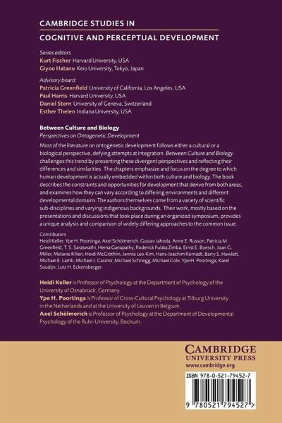Introduction Heidi Keller, Ype H. Poortinga and Axel Schölmerich; Part I. Setting the Scene: 1. Culture, biology and development across history Gustav Jahoda; 2. Comparative developmental perspectives on culture: the great apes Anne E. Russon; 3. The mutual definition of culture and biology in development Patricia M. Greenfield; Part II. Perspectives on Development Informed by Culture: 4. Indian parents' ethnotheories as reflections of the Hindu scheme of child and human development T. S. Saraswathi and Hema Ganapathy; 5. Indigenous conceptions of childhood development and social realities in Southern Africa Roderick Fulata Zimba; 6. The myth of lurking chaos Ernst E. Boesch; 7. Integrating cultural psychological and biological perspectives in understanding child development Joan G. Miller; Part III. Perspectives on development drawing from the universal and the specific: 8. Between individuals and culture: Individuals' evaluations of exclusion from social groups Melanie Killen, Heidi McGlothlin and Jennie Lee-Kim; 9. Biology, culture and child rearing: the development of social motives Hans-Joachim Kornadt; Part IV. Perspectives on Development Informed by Evolutionary Thinking: 10. Development as the interface between biology and culture: a conceptualisation of early ontogenetic experiences Heidi Keller; 11. Integrating evolution, culture and developmental psychology: explaining caregiver-infant proximity and responsiveness in Central Africa and the United States of America Barry S. Hewlett and Michael E. Lamb; 12. Shame across cultures: the evolution, ontogeny, and function of a 'moral emotion' Michael J. Casimir and Michael Schnegg; Part V. Metaperspectives: 13. Culture and development Michael Cole; Behaviour-culture relationships and ontogenetic development Ype H. Poortinga and Karel Soudijn; 15. Paradigms revisited: from incommensurability to respected complementarity Lutz H. Eckensberger; 16. Conceptions of ontogenetic development: integrating and demarcating perspectives Heidi Keller, Ype H. Poortinga and Axel Schölmerich.