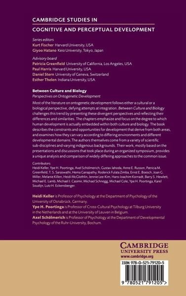 Introduction Heidi Keller, Ype H. Poortinga and Axel Schölmerich; Part I. Setting the Scene: 1. Culture, biology and development across history Gustav Jahoda; 2. Comparative developmental perspectives on culture: the great apes Anne E. Russon; 3. The mutual definition of culture and biology in development Patricia M. Greenfield; Part II. Perspectives on Development Informed by Culture: 4. Indian parents' ethnotheories as reflections of the Hindu scheme of child and human development T. S. Saraswathi and Hema Ganapathy; 5. Indigenous conceptions of childhood development and social realities in Southern Africa Roderick Fulata Zimba; 6. The myth of lurking chaos Ernst E. Boesch; 7. Integrating cultural psychological and biological perspectives in understanding child development Joan G. Miller; Part III. Perspectives on development drawing from the universal and the specific: 8. Between individuals and culture: Individuals' evaluations of exclusion from social groups Melanie Killen, Heidi McGlothlin and Jennie Lee-Kim; 9. Biology, culture and child rearing: the development of social motives Hans-Joachim Kornadt; Part IV. Perspectives on Development Informed by Evolutionary Thinking: 10. Development as the interface between biology and culture: a conceptualisation of early ontogenetic experiences Heidi Keller; 11. Integrating evolution, culture and developmental psychology: explaining caregiver-infant proximity and responsiveness in Central Africa and the United States of America Barry S. Hewlett and Michael E. Lamb; 12. Shame across cultures: the evolution, ontogeny, and function of a 'moral emotion' Michael J. Casimir and Michael Schnegg; Part V. Metaperspectives: 13. Culture and development Michael Cole; Behaviour-culture relationships and ontogenetic development Ype H. Poortinga and Karel Soudijn; 15. Paradigms revisited: from incommensurability to respected complementarity Lutz H. Eckensberger; 16. Conceptions of ontogenetic development: integrating and demarcating perspectives Heidi Keller, Ype H. Poortinga and Axel Schölmerich.