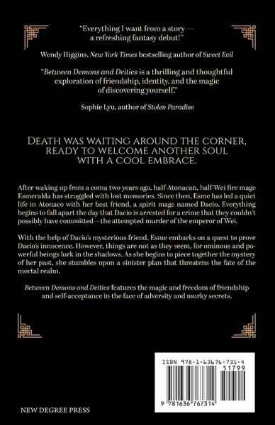 Death was waiting around the corner, ready to welcome another soul with a cool embrace. After waking up from a coma two years ago, half-Atonacan, half-Wei fire mage Esmeralda has struggled with lost memories. Since then, Esme has led a quiet life in Atonaco with her best friend, a spirit mage named Dacio. Everything begins to fall apart the day that Dacio is arrested for a crime that they couldn't possibly have committed-the attempted murder of the emperor of Wei. With the help of Dacio's mysterious friend, Esme embarks on a quest to prove Dacio's innocence. However, things are not as they seem, for ominous and powerful beings lurk in the shadows. As she begins to piece together the mystery of her past, she stumbles upon a sinister plan that threatens the fate of the mortal realm. Between Demons and Deities features the magic and freedom of friendship and self-acceptance in the face of adversity and murky secrets.