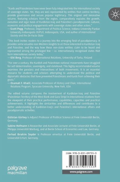 This book compares the involvement of Kurdistan-Iraq and Palestine (Palestinian Territory of the West Bank and Gaza Strip) in international relations from the viewpoint of their practical performance. In particular, it provides an overview over the current Kurdish and Palestinian paradiplomatic activities and their practical performance in terms of their capabilities, capacities and practical achievements. The contributing authors analyze the evolution of paradiplomacy, the domestic legal and institutional framework, the goals, instruments, and capabilities of Kurdish and Palestinian paradiplomacy, and selected foreign relations. The book identifies the similarities and differences between the paradiplomacy of Kurdistan-Iraq and Palestine with regard to a set of guidelines: causes, legal foundations, institutionalization, predominant motives, practical implementation, and outcomes of paradiplomacy. It provides empirical explanations about how and why Kurdistan-Iraq and Palestine develop and practice paradiplomacy and contributes to a better understanding of Kurdistan-Iraq's and Palestine's involvement in international affairs and their activities.