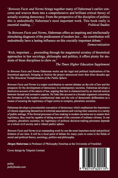 For at least a generation Jurgen Habermas s work has made a significant impact on a variety of important debates in philosophy and the social sciences. Between Facts and Norms ... brings together many of Habermas s earlier concerns and weaves them into a comprehensive and brilliant critical theory of actually existing democracy. From the perspective of the discipline of politics this is undoubtedly Habermas s most important work. Of course, Habermas s work is dense, challenging and incredibly broad in its range. It is also controversial, and this work will certainly not win over his most trenchant critics. None of this amounts to a valid excuse to ignore it. This book really is essential reading for anyone who is interested in exploring at depth the possibilities of realizing a genuinely democratic future. Political Studies