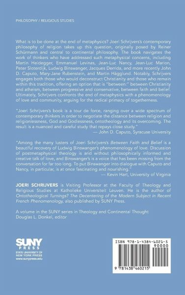 What is to be done at the end of metaphysics? Joeri Schrijvers's contemporary philosophy of religion takes up this question, originally posed by Reiner Schürmann and central to continental philosophy. The book navigates the work of thinkers who have addressed such metaphysical concerns, including Martin Heidegger, Emmanuel Levinas, Jean-Luc Nancy, Jean-Luc Marion, Peter Sloterdijk, Ludwig Binswanger, Jacques Derrida, and more recently John D. Caputo, Mary-Jane Rubenstein, and Martin Hägglund. Notably, Schrijvers engages both those who would deconstruct Christianity and those who remain within this tradition, offering an option that is "between:" between Christianity and atheism, between progressive and conservative, between faith and belief. Ultimately, Schrijvers confronts the end of metaphysics with a phenomenology of love and community, arguing for the radical primacy of togetherness.