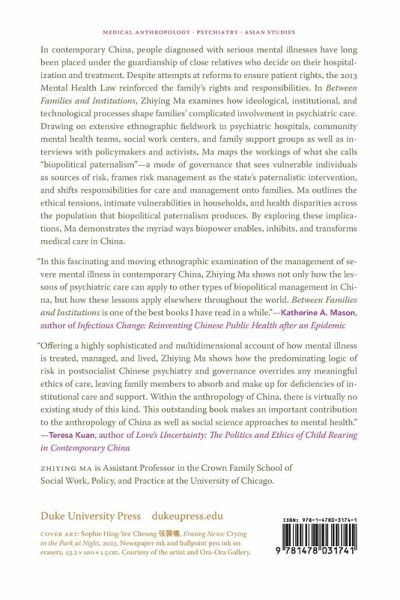 In contemporary China, people diagnosed with serious mental illnesses have long been placed under the guardianship of close relatives who decide on their hospitalization and treatment. Despite attempts at reforms to ensure patient rights, the 2013 Mental Health Law reinforced the family's rights and responsibilities. In Between Families and Institutions, Zhiying Ma examines how ideological, institutional, and technological processes shape families' complicated involvement in psychiatric care. Drawing on extensive ethnographic fieldwork in psychiatric hospitals, community mental health teams, social work centers, and family support groups as well as interviews with policymakers and activists, Ma maps the workings of what she calls "biopolitical paternalism"-a mode of governance that sees vulnerable individuals as sources of risk, frames risk management as the state's paternalistic intervention, and shifts responsibilities for care and management onto families. Ma outlines the ethical tensions, intimate vulnerabilities in households, and health disparities across the population that biopolitical paternalism produces. By exploring these implications, Ma demonstrates the myriad ways biopower enables, inhibits, and transforms medical care in China.