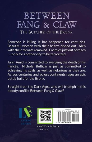 Someone is killing. It has happened for centuries. Beautiful women with their hearts ripped out. Men with their throats removed. Enemies just out of reach . . . only for another city to be terrorized. Jahir Amid is committed to avenging the death of his fiancée. Nicholai Bultizar is just as committed to achieving his goals, as well, as nefarious as they are. Across centuries and across continents rages an epic battle built for the Bronx. Straight from the Dark Ages, who will triumph in this bloody conflict Between Fang & Claw?