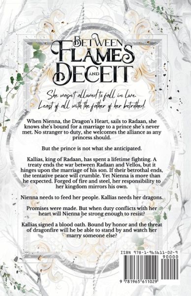 She wasn't allowed to fall in love. Least of all with the father of her betrothed. When Nienna, the Dragon's Heart, sails to Radaan, she knows she's bound for a marriage to a prince she's never met. No stranger to duty, she welcomes the alliance as any princess should. But the prince is not what she anticipated. Kallias, king of Radaan, has spent a lifetime fighting. A treaty ends the war between Radaan and Vellos, but it hinges upon the marriage of his son. If their betrothal ends, the tentative peace will crumble. Yet Nienna is more than he expected. Forged of fire and steel, her responsibility to her kingdom mirrors his own. Nienna needs to feed her people. Kallias needs her dragons. Promises were made. But when duty conflicts with her heart will Nienna be strong enough to resist? Kallias signed a blood oath. Bound by honor and the threat of dragonfire will he be able to stand by and watch her marry someone else? Between Flames and Deceit is a forbidden love, age gap romance. Perfect for lovers of Fourth Wing and Mariana Zapata!