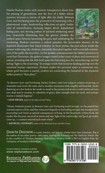 Danita Dodson writes with emotive transparency about loss, the passing of generations, and the love of a father whose memory becomes a source of light after his death. Between Gone and Everlasting pans the perimeters of mourning with a phenomenal scope: heartrending reflections on grief, tender odes of remembrance, stunning elegies about Appalachia's fading past, and stirring psalms of spiritual awakening amid loss. Gracefully illustrating how the griever inhabits the umbral space between lamenting the gone and celebrating the everlasting, Dodson examines a central paradox: the irrevocable absence of the departed illuminates that which remains. In these poems, the past echoes inside the present with song-like rhythms, intricately threaded together with a warmth reminiscent of the quilts she describes. As the speaker commemorates her father's presence in rural East Tennessee, she gathers images rooted in her sense of place and reverence of nature, revealing that the hills hold space for honoring loss, for remembering, and for seeing ""light in the mourning."" In energic words that summon healing and tap into the universal human experience, Dodson makes the personal space a communal one, where grief becomes a sacred, creative act connecting the bereaved to the departed within poetry's ""thin place.""