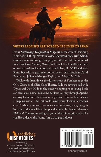 From Saddlebag Dispatches Magazine, the Award-Winning Home of All Things Western, comes Between Hell and Tombstone, a new anthology bringing you the best of the untamed west. Paul Colt, Anthony Wood, and P.A. O'Neil headline a roster of western writers including old hands like J.R. Wolff and Alex Slusar but with a great selection of newer talent such as David Bowmore, Julianne Metzger Taylor, and Megan McCain. Walk with them down the dusty streets of Tombstone to the O.K. Corral or the Bird Cage Theatre. Ride the revenge trail with Wyatt and Doc. Hide in the shadows hoping your young bride can clear your name. Make the perilous journey through Apache country from Fort Huachuca to anywhere. This is a land where, as Kipling wrote, "the 'eat could make your bloomin' eyebrows crawl," where a summer monsoon can wash away everything in its path, and where life is cheap and a bullet is cheaper. Between Hell and Tombstone will grab you with an iron grip and shake you like a dog with a bone. Just try to put it down.