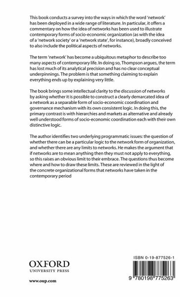 This text conducts a survey into the ways in which the word "network" has been deployed in a wide range of literature. In particular, it offers a commentary on how the idea of networks has been used to illustrate contemporary forms of socio-economic organization (as with the idea of a "network society" or a "network state", for instance), broadly conceived to also include the political aspects of networks. The term "network" has become a ubiquitous metaphor to describe too many aspects of contemporary life. In doing so, Grahame Thompson argues, the term has lost much of its analytical precision and has no clear conceptual underpinnings. The problem is that something claiming to explain everything ends up by explaining very little. The book brings some intellectual clarity to the discussion of networks by asking whether it is possible to construct a clearly demarcated idea of a network as a separable form of socio-economic co-ordination and governance mechanism with its own consistent logic. In doing this, the primary contrast is with hierarchies and markets as alternative and already well understood forms of socio-economic co-ordination each with their own distinctive logic.