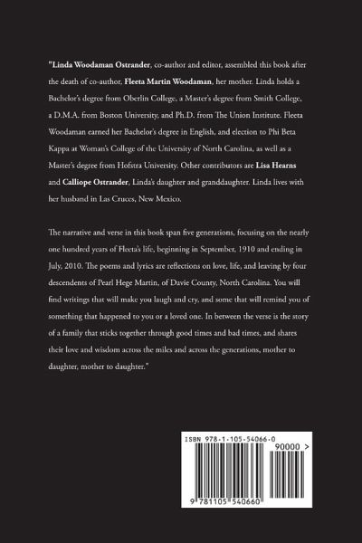 The narrative and verse in this book span five generations, focusing on the nearly 100 years of my mother's life. The book is organized in three sections, love, life and leaving. Between the verse is the story of a family that sticks together through good and bad times, and shares their love and wisdom across the miles and across the generations, mother to daughter.