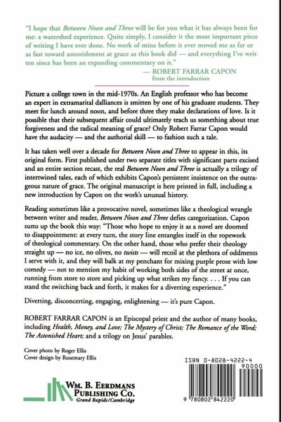 Picture a college town in the mid- 1970s. An English professor who has become an expert in extramarital dalliances is smitten by one of his graduate students. They meet for lunch around noon, and before three they make declarations of love. Is it possible that their subsequent affair could ultimately teach us something about true forgiveness and the radical meaning of grace? Only Robert Farrar Capon would have the audacity — and the authorial skill — to fashion such a tale. It has taken well over a decade for Between Noon and Three to appear in this, its original form. First published under two separate titles with significant parts excised and an entire section recast, the real Between Noon and Three is actually a trilogy of intertwined tales, each of which exhibits Capon's persistent insistence on the outrageous nature of grace. The original manuscript is here printed in full, including a new introduction by Capon on the work's unusual history. Reading sometimes like a provocative novel, sometimes like a theological wrangle between writer and reader, Between Noon and Three defies categorization. Capon sums up the book this way: "Those who read it as a novel are doomed to disappointment: at every turn, the story line entangles itself in theological ropework. On the other hand, those who prefer their theology straight up — no ice, no olives, no twists — will recoil at the plethora of oddments I serve with it, not to mention my penchant for mixing purple prose with low comedy. I always work two sides of the street at once, running from store to store, picking up what strikes my fancy. If you can stand the switching back and forth, it makes for a diverting experience." Diverting, disconcerting, engaging, enlightening — it's pure Capon.