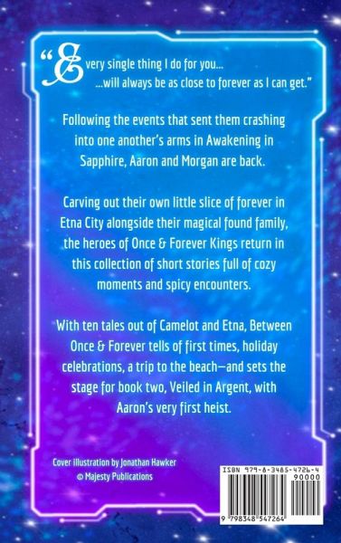 "Every single thing I do for you... will always be as close to forever as I can get." Following the events that sent them crashing into one another's arms in Awakening in Sapphire, Aaron and Morgan are back. Carving out their own little slice of forever in Etna City alongside their magical found family, the heroes of Once & Forever Kings return in this collection of short stories full of cozy moments and spicy encounters. With ten tales out of Camelot and Etna, Between Once & Forever tells of first times, holiday celebrations, a trip to the beach-and sets the stage for book two, Veiled in Argent, with Aaron's very first heist. This short story collection is a companion to the Once & Forever Kings series and is not intended to be read as a standalone, nor does it need to be read to fully enjoy the following books.