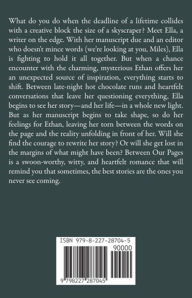 What do you do when the deadline of a lifetime collides with a creative block the size of a skyscraper? Meet Ella, a writer on the edge. With her manuscript due and an editor who doesn't mince words (we're looking at you, Miles), Ella is fighting to hold it all together. But when a chance encounter with the charming, mysterious Ethan offers her an unexpected source of inspiration, everything starts to shift. Between late-night hot chocolate runs and heartfelt conversations that leave her questioning everything, Ella begins to see her story-and her life-in a whole new light. But as her manuscript begins to take shape, so do her feelings for Ethan, leaving her torn between the words on the page and the reality unfolding in front of her. Will she find the courage to rewrite her story? Or will she get lost in the margins of what might have been? Between Our Pages is a swoon-worthy, witty, and heartfelt romance that will remind you that sometimes, the best stories are the ones you never see coming.