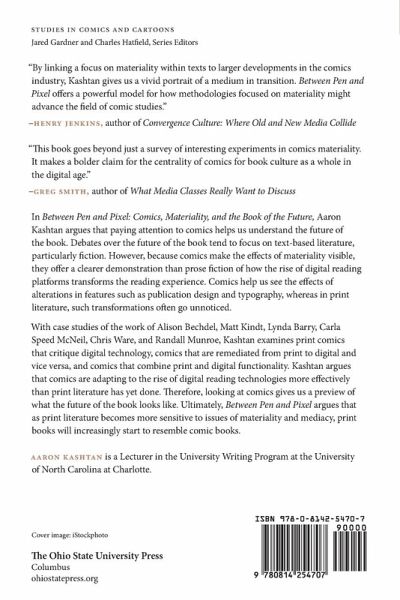 2019 Will Eisner Comic Industry Award Nominee, Best Academic/Scholarly Work In Between Pen and Pixel: Comics, Materiality, and the Book of the Future, Aaron Kashtan argues that paying attention to comics helps us understand the future of the book. Debates over the future of the book tend to focus on text-based literature, particularly fiction. However, because comics make the effects of materiality visible, they offer a clearer demonstration than prose fiction of how the rise of digital reading platforms transforms the reading experience. Comics help us see the effects of alterations in features such as publication design and typography, whereas in print literature, such transformations often go unnoticed. With case studies of the work of Alison Bechdel, Matt Kindt, Lynda Barry, Carla Speed McNeil, Chris Ware, and Randall Munroe, Kashtan examines print comics that critique digital technology, comics that are remediated from print to digital and vice versa, and comics that combine print and digital functionality. Kashtan argues that comics are adapting to the rise of digital reading technologies more effectively than print literature has yet done. Therefore, looking at comics gives us a preview of what the future of the book looks like. Ultimately, Between Pen and Pixel argues that as print literature becomes more sensitive to issues of materiality and mediacy, print books will increasingly start to resemble to comic books.