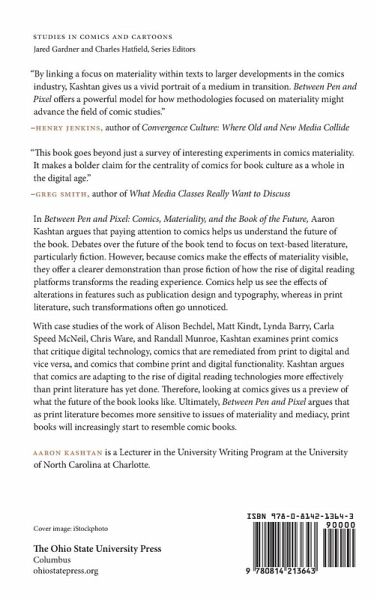2019 Will Eisner Comic Industry Award Nominee, Best Academic/Scholarly Work In Between Pen and Pixel: Comics, Materiality, and the Book of the Future, Aaron Kashtan argues that paying attention to comics helps us understand the future of the book. Debates over the future of the book tend to focus on text-based literature, particularly fiction. However, because comics make the effects of materiality visible, they offer a clearer demonstration than prose fiction of how the rise of digital reading platforms transforms the reading experience. Comics help us see the effects of alterations in features such as publication design and typography, whereas in print literature, such transformations often go unnoticed. With case studies of the work of Alison Bechdel, Matt Kindt, Lynda Barry, Carla Speed McNeil, Chris Ware, and Randall Munroe, Kashtan examines print comics that critique digital technology, comics that are remediated from print to digital and vice versa, and comics that combine print and digital functionality. Kashtan argues that comics are adapting to the rise of digital reading technologies more effectively than print literature has yet done. Therefore, looking at comics gives us a preview of what the future of the book looks like. Ultimately, Between Pen and Pixel argues that as print literature becomes more sensitive to issues of materiality and mediacy, print books will increasingly start to resemble to comic books.