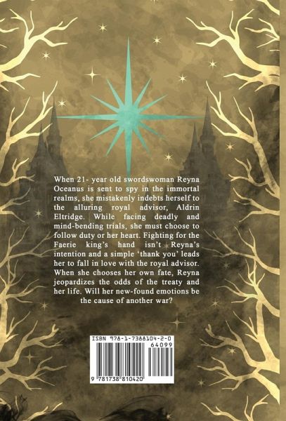 The waltz of shadows and stars is a lethal dance When 21- yr old swordswoman Reyna Oceanus is sent to spy in the immortal realms, she mistakenly indebts herself to the alluring royal advisor, Aldrin Eltridge. While facing deadly and mind-bending trials, she must choose to follow duty or her heart. Fighting for the Faerie king's hand isn't Reyna's intention and a simple 'thank you' leads her to fall in love with the royal advisor. When she chooses her own fate, Reyna jeopardizes the odds of the treaty and her life. Will her new-found emotions be the cause of another war?