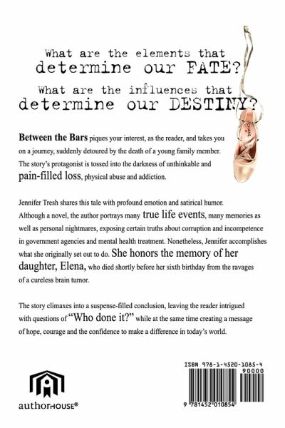 What are the elements that determine our fate? What are the influences that determine our destiny? Between the Bars piques your interest, as the reader, and takes you on a journey, suddenly detoured by the death of a young family member. The story's protagonist is tossed into the darkness of unthinkable pain-filled loss, physical abuse and addiction. Jennifer Tresh shares this tale with profound emotion and satirical humor. Although a novel, the author portrays many true-life events, many memories as well as personal nightmares, exposing certain truths about corruption and incompetence in government agencies and mental health treatment. Nonetheless, Jennifer accomplishes what she set out to do. She honors the memory of her daughter, Elena, who died shortly before her sixth birthday from the ravages of a cureless brain tumor. The story climaxes into a suspense-filled conclusion, leaving the reader intrigued with questions of "Who done it?" while at the same time creating a message of hope, courage and the confidence to make a difference in today's world.