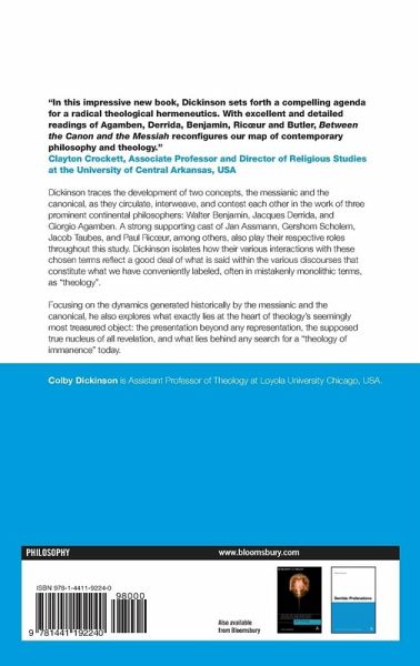 Dickinson traces the development of two concepts, the messianic and the canonical, as they circulate, interweave and contest each other in the work of three prominent continental philosophers: Walter Benjamin, Jacques Derrida and Giorgio Agamben, though a strong supporting cast of Jan Assmann, Gershom Scholem, Jacob Taubes and Paul Ricoeur, among others, also play their respective roles throughout this study. He isolates how their various interactions with their chosen terms reflects a good deal of what is said within the various discourses that constitute what we have conveniently labelled, often in mistakenly monolithic terms, as 'Theology'. By narrowing the scope of this study to the dynamics generated historically by these contrasting terms, he also seeks to determine what exactly lies at the heart of theology's seemingly most treasured object: the presentation beyond any representation, the supposed true nucleus of all revelation and what lies behind any search for a 'theology of immanence' today.
