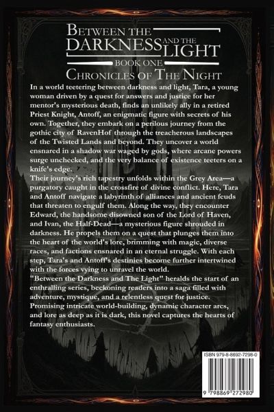 BETWEEN THE DARKNESS AND THE LIGHT, CHRONICLES OF THE NIGHT BOOK ONE. The novel is an epic fantasy exploring power, balance, and the war between light and darkness. The first book, Chronicles of the Night Book One, the novel opens in a world caught between darkness and light, with the story centering around Tara, a determined young woman seeking answers and justice following the mysterious death of her mentor. Teaming up with her enigmatic companion, Antoff, she embarks on a perilous journey to uncover the truth. As they delve deeper into the secrets of their world, they encounter gods at war, arcane powers, and a shattered balance that threatens their existence. The atmospheric descriptions of the gothic medieval setting surrounded by Coth'Venter, an ancient ruin encircling the smaller city of RavenHof, loomed as a devouring grey metropolis, a haunting symbol of a long-dead civilization and a reminder of the world's grandeur before the breaking of the balance. The world-building is rich and immersive, offering readers a unique setting with a demilitarized zone known as the Grey Area, serving as the middle space between the conflict. The characters are well-crafted and relatable, with Tara's determination and thirst for knowledge driving the narrative. Antoff's mysterious nature adds intrigue, and the dynamic between the two initial protagonists is engaging and propels the story forward. Between the Darkness and The Light will captivate a wide audience of fantasy readers. Its strong characters, immersive world-building, and intriguing plot make it a compelling addition to the genre. At its heart, "Between the Darkness and The Light" is a story about choices and their consequences, about the search for meaning in a world that is at war with itself. This novel will appeal to readers who enjoy epic fantasy and stories that grapple with complex themes and the development of complex characters.