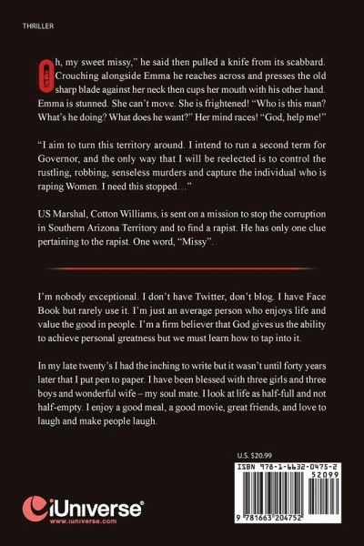 Oh, my sweet missy," he said then pulled a knife from its scabbard. Crouching alongside Emma he reaches across and presses the old sharp blade against her neck then cups her mouth with his other hand. Emma is stunned. She can't move. She is frightened! "Who is this man? What's he doing? What does he want?" Her mind races! "God, help me!" "I aim to turn this territory around. I intend to run a second term for Governor, and the only way that I will be reelected is to control the rustling, robbing, senseless murders and capture the individual who is raping Women. I need this stopped..." US Marshal, Cotton Williams, is sent on a mission to stop the corruption in Southern Arizona Territory and to find a rapist. He has only one clue pertaining to the rapist. One word, "Missy".