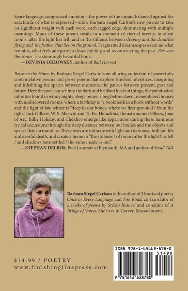 Between the Hours is a collection of poems, some in prose form, that meditate on the paradoxical nature of time. Using spare language to evoke "a mystery inside the clear day," each poem reveals a glimpse of a liminal space unseen and most often overlooked when we are focused on daily concerns. Beginning with "Cloud 0," the collection traces through lost hours, darkness, wind, sleep, snow to gather a sense of what passes through. The word "clear" appears many times in this chapbook that opens "a hand in a dream/that doesn't let go." The imagery, often from the natural world, conjures memories and dreams as well as history, science, philosophy and spirituality transforming the moment into one of eternity.