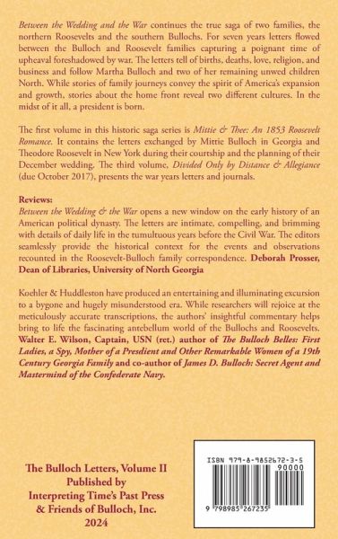Between the Wedding and the War continues the true saga of two families, the northern Roosevelts, residents of New York City and the southern Bullochs, living in rural northern Georgia. For seven years, letters flowed between the Bulloch and Roosevelt families capturing a poignant time of familial upheaval foreshadowed by war. The letters tell of births, deaths, love, religion, and business and follow the family matriarch, Martha Bulloch, and two of her remaining unwed children North, to be with her two married daughters. Amist the letters are stories of family journeys, and the spirit of America's expansion and growth. These stories about the home front reveal two different cultures, one northern and one souther. In the midst of it all, a president is born. Transcribed and presented as written in the mid-1800s, these letters illustrate a world often presented in film and fiction but here presented as personal history.The The first volume in this historic saga series is Mittie & Thee: An 1853 Roosevelt Romance. It contains the letters exchanged by Mittie Bulloch in Georgia and Theodore Roosevelt in New York during their courtship and the planning of their December wedding. The third volume, Divided only by Distance & Allegiance presents the war years letters and journals.