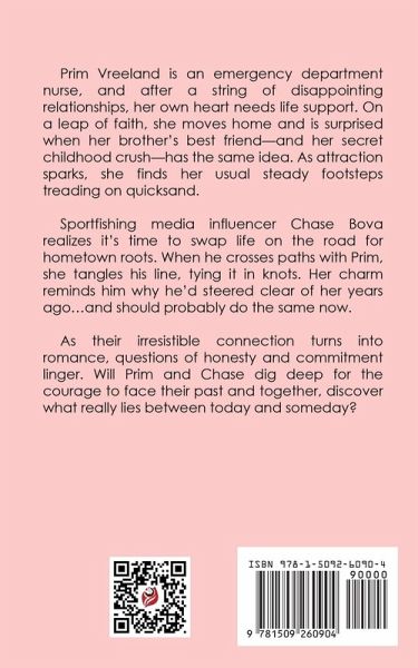 Prim Vreeland is an emergency department nurse, and after a string of disappointing relationships, her own heart needs life support. On a leap of faith, she moves home and is surprised when her brother's best friend-and her secret childhood crush-has the same idea. As attraction sparks, she finds her usual steady footsteps treading on quicksand. Sportfishing media influencer Chase Bova realizes it's time to swap life on the road for hometown roots. When he crosses paths with Prim, she tangles his line, tying it in knots. Her charm reminds him why he'd steered clear of her years ago...and should probably do the same now. As their irresistible connection turns into romance, questions of honesty and commitment linger. Will Prim and Chase dig deep for the courage to face their past and together, discover what really lies between today and someday?