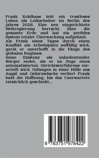 Frank Kohlhaas lebt ein trostloses Leben als Leiharbeiter im Berlin des Jahres 2028. Eine neu eingerichtete Weltregierung herrscht über die gesamte Erde und hat ein perfides System totaler Überwachung aufgebaut. Als Frank eines Tages durch einen Konflikt am Arbeitsplatz auffällig wird, gerät er unverhofft in die Fänge des globalen Regimes. Seine Existenz als unbedeutender Bürger endet, als er im Zuge eines automatisierten Gerichtsverfahrens verurteilt wird. Gefangen in einer Hölle aus Angst und Gehirnwäsche verliert Frank bald die Hoffnung, bis das Unerwartete tatsächlich geschieht...