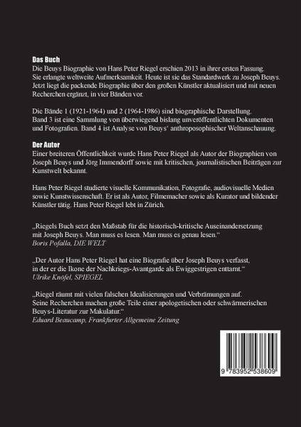 Die Beuys Biographie von Hans Peter Riegel erschien 2013 in ihrer ersten Fassung. Sie erlangte weltweite Aufmerksamkeit. Heute ist sie das Standardwerk zu Joseph Beuys. Jetzt liegt die packende Biographie über den großen Künstler aktualisiert und mit neuen Recherchen ergänzt, in vier Bänden vor.Der neue 4. Band ist eine Analyse von bislang weitgehend unbekannten Beuys Reden und Interviews, in denen es primär um seine anthroposophische Weltanschauung, seine politischen Ansichten wie seine Haltung zur NS-Zeit geht.Die Bände 1 (1921-1964) und 2 (1964-1986) sind biographische Darstellung.Band 3 ist eine Sammlung von überwiegend bislang unveröffentlichten Dokumenten und Fotografien. Riegels Buch setzt den Maßstab für die historisch-kritische Auseinandersetzung mit Joseph Beuys. Man muss es lesen. Man muss es genau lesen. Boris Pofalla, DIE WELT