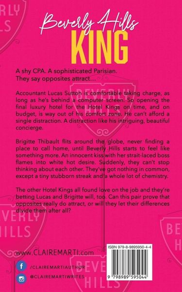 A shy CPA. A sophisticated Parisian. They say opposites attract... Accountant Lucas Sutton is comfortable taking charge, as long as he's behind a computer screen. So opening the final luxury hotel for the Hotel Kings on time, and on budget, is way out of his comfort zone. He can't afford a single distraction. A distraction like his intriguing, beautiful concierge. Brigitte Thibault flits around the globe, never finding a place to call home, until Beverly Hills starts to feel like something more. An innocent kiss with her strait-laced boss flames into white hot desire. Suddenly, they can't stop thinking about each other. They've got nothing in common, except a tiny stubborn streak and a whole lot of chemistry. The other Hotel Kings all found love on the job and they're betting Lucas and Brigitte will, too. Can this pair prove that opposites really do attract, or will they let their differences divide them after all? ***Beverly Hills King is the sixth book in award-winning and USA Today bestselling author Claire Marti's spin off contemporary romance series, California Suits. The series follows the adventures of five best friends who are opening a string of luxury boutique hotels from La Jolla to Monterey to Beverly Hills as each one finds true love...usually where he least expects it. Each book is a standalone.