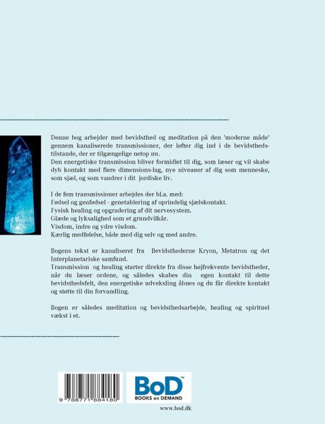 Denne bog arbejder med bevidsthed og meditation på den 'moderne måde' gennem kanaliserede transmissioner, der løfter dig ind i de bevidstheds-tilstande, der er tilgængelige netop nu. Den energetiske transmission bliver formidlet til dig, som læser og vil skabe dyb kontakt med flere dimensions-lag, nye niveauer af dig som menneske, som sjæl, og som vandrer i dit jordiske liv. I de fem transmissioner arbejdes der bl.a. med: - Fødsel og genfødsel -genetablering af oprindelig sjælskontakt. - Fysisk healing og opgradering af dit nervesystem. - Glæde og lyksalighed som et grundvilkår. - Visdom, indre og ydre visdom. - Kærlig medfølelse, både med dig selv og med andre. Bogens tekst er kanaliseret fra Bevidsthederne Kryon, Metatron og det Interplanetariske samfund. Transmission og healing starter direkte fra disse højfrekvente bevidstheder, når du læser ordene, og således skabes din egen kontakt til dette bevidsthedsfelt, den energetiske udveksling åbnes og du får direkte kontakt og støtte til din forvandling. Bogen er således meditation og bevidsthedsarbejde, healing og spirituel vækst i et.