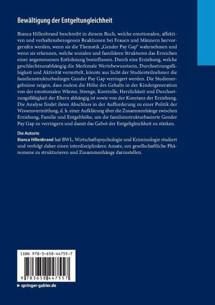 Bianca Hillenbrand beschreibt in diesem Buch, welche emotionalen, affektiven und verhaltensbezogenen Reaktionen bei Frauen und Männern hervorgerufen werden, wenn sie die Thematik "Gender Pay Gap" wahrnehmen und wenn sie erkennen, welche sozialen und familiären Strukturen das Erreichen einer angemessenen Entlohnung beeinflussen. Durch eine Erziehung, welche geschlechtsunabhängig die Merkmale Wertebewusstsein, Durchsetzungsfähigkeit und Aktivität vermittelt, könnte aus Sicht der Studienteilnehmer die familienstrukturbedingte Gender Pay Gap verringert werden. Die Studienergebnisse zeigen, dass zudem die Höhe des Gehalts in der Kindergeneration von der emotionalen Wärme, Strenge, Kontrolle, Herzlichkeit und Durchsetzungsfähigkeit der Eltern abhängig ist sowie von der Konstanz der Erziehung. Die Analyse findet ihren Abschluss in der Aufforderung zu einer Politik der Wissensvermittlung, d.h. einer Aufklärung über die Zusammenhänge zwischen Erziehung, Familie und Entgelthöhe, um diefamilienstrukturbasierte Gender Pay Gap zu verringern und damit das Gebot der Entgeltgleichheit zu stärken.