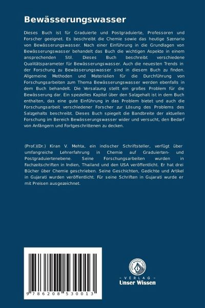 Dieses Buch ist für Graduierte und Postgraduierte, Professoren und Forscher geeignet. Es beschreibt die Chemie sowie das heutige Szenario von Bewässerungswasser. Nach einer Einführung in die Grundlagen von Bewässerungswasser behandelt das Buch die wichtigen Aspekte in einem ansprechenden Stil. Dieses Buch beschreibt verschiedene Qualitätsparameter für Bewässerungswasser. Auch die neuesten Trends in der Forschung zu Bewässerungswasser sind in diesem Buch zu finden. Allgemeine Methoden und Materialien für die Durchführung von Forschungsarbeiten zum Thema Bewässerungswasser werden ebenfalls in dem Buch behandelt. Die Versalzung stellt ein großes Problem für die Bewässerung dar. Ein spezielles Kapitel über den Salzgehalt ist in dem Buch enthalten, das eine gute Einführung in das Problem bietet und auch die Forschungsarbeit verschiedener Forscher zur Lösung des Problems des Salzgehalts beschreibt. Dieses Buch spiegelt die Bandbreite der aktuellen Forschung im Bereich Bewässerungswasser wider und versucht, den Bedarf von Anfängern und Fortgeschrittenen zu decken.