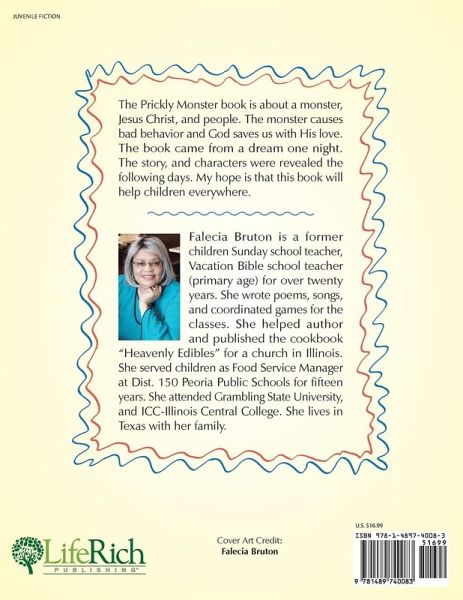 The Prickly Monster book is about a monster, Jesus Christ, and people. The monster causes bad behavior and God saves us with His love. The book came from a dream one night. The story, and characters were revealed the following days. My hope is that this book will help children everywhere.